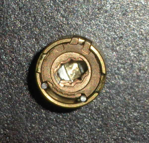 It's kind of hard to see here but where the plate hits the key you can see a little bitty tab that does into one dimple of the key. This is where I was talking earlier about how the padlock version uses one set of dimples but some other locks use 2. The other locks use ball bearings in place of the anti-drill plates (or so I have been told). Notice how you can see the groove in the cylinder where the tab on the plate was forced into in the last picture.